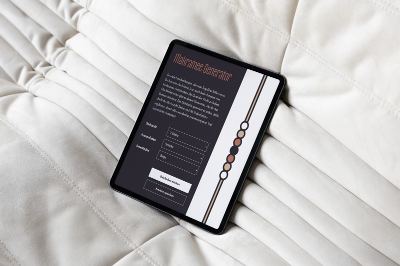 Da kam Esther Martin ins Spiel, welche leidenschaftlich gerne Makramee-Armbänder knüpft und ihr allmählich die Ideen für neue Farbkombinationen ausgingen. Darum entschied ich mich dazu, einen Makramee-Generator mit HTML und CSS zu programmieren und ihr Bedürfnis mit der Studienarbeit zu verknüpfen. Die Steinfarben werden dabei zufällig generiert, während die Anzahl der Steine sowie die Fadenfarben individuell angepasst werden können.